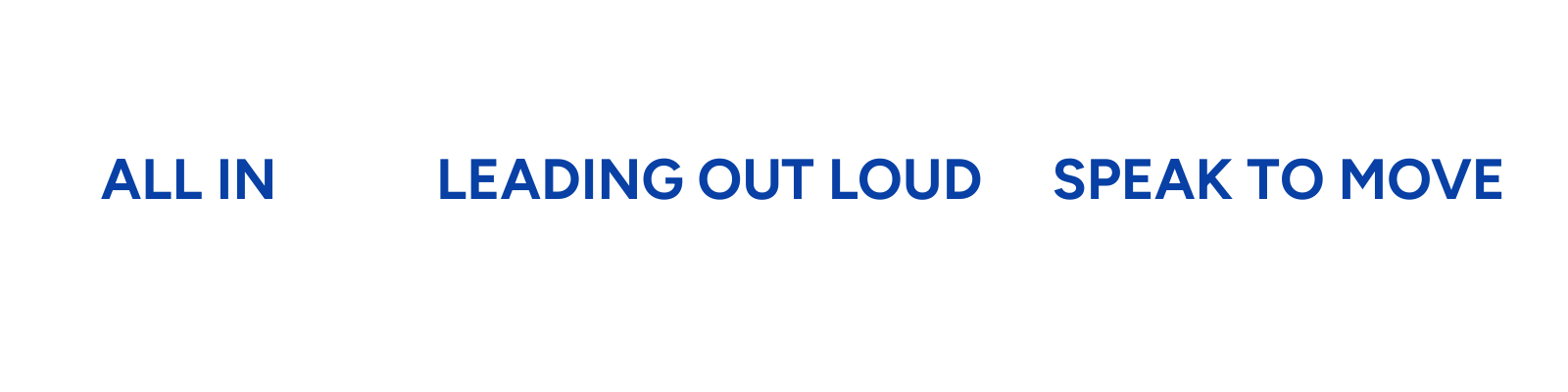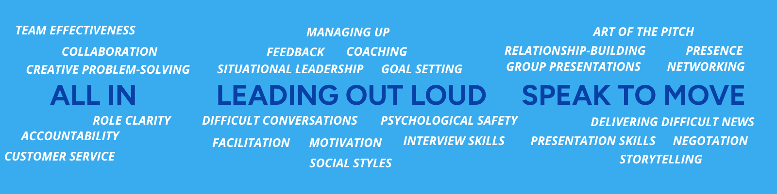 We devise custom leadership training programs based on the needs of our clients. Typically these fall within three content clusters, appropriate to three different stages of leadership: All In (for Teams), Leading Out Loud (for People Leaders), and Speak to Move (for Impact & Influence).